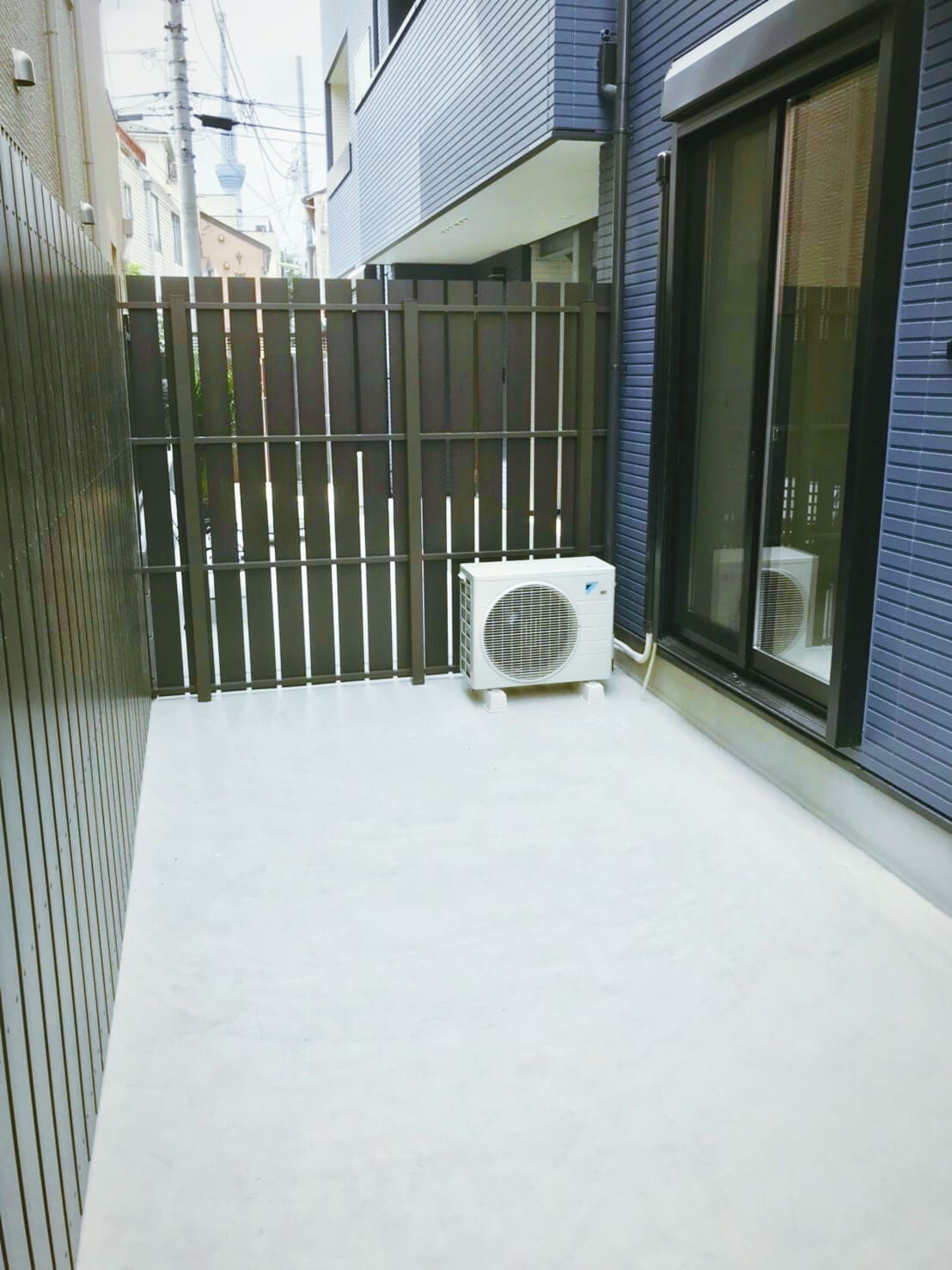 こちらのお部屋だけ、立派なテラスがあります。幅があるので、ちょっとしたベンチとグリーンぐらいは置けそうです。柵の高さは約2メートル、猫ちゃんとテラスに出るときは、念のためハーネスなどで脱走防止を。安心して一緒にひなたぼっこしたいですね。